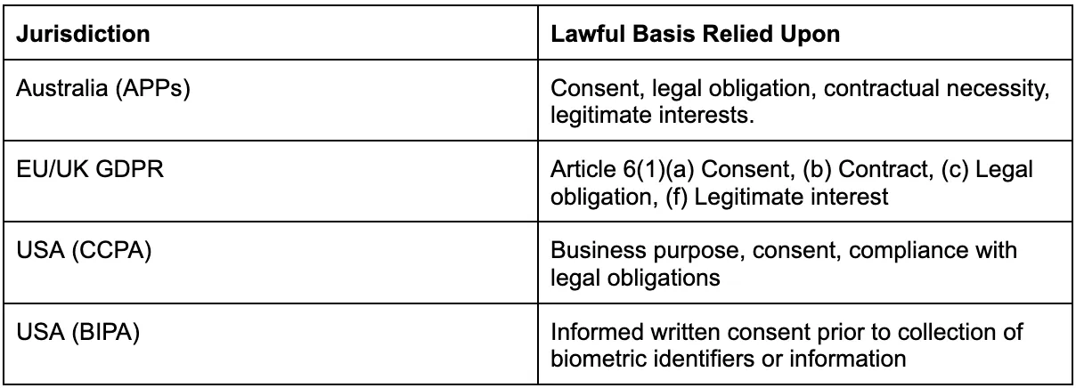 This process is conducted in compliance with APPs 1, 3, 6, and 11, GDPR Articles 5-9, and BIPA 15.